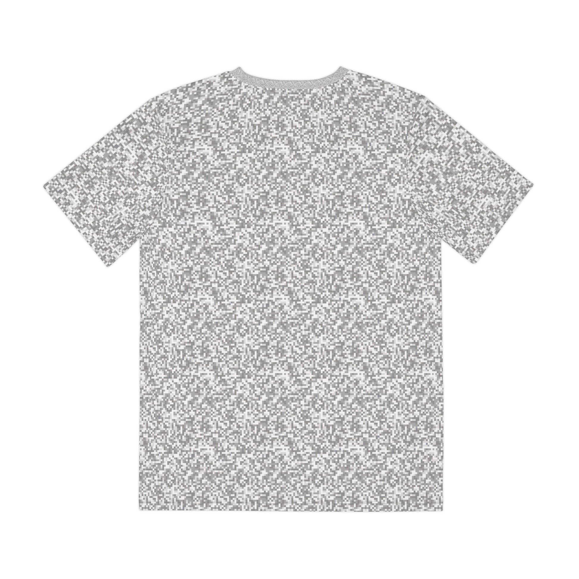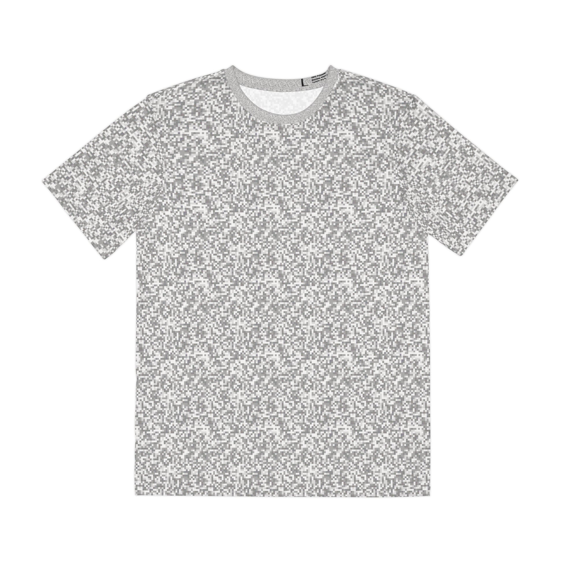 Men's Polyester Tee with an adversarial image in digital snow camo pattern to reduce ai facial tracking detection by 70-85%. Gives a rebellious and tech-savvy vibe, perfect for individuals concerned about privacy and surveillance. Ideal for tech enthusiasts, privacy advocates, and those who enjoy unique and innovative fashion. Relevant for tech holidays, privacy awareness events, and hacker conventions.